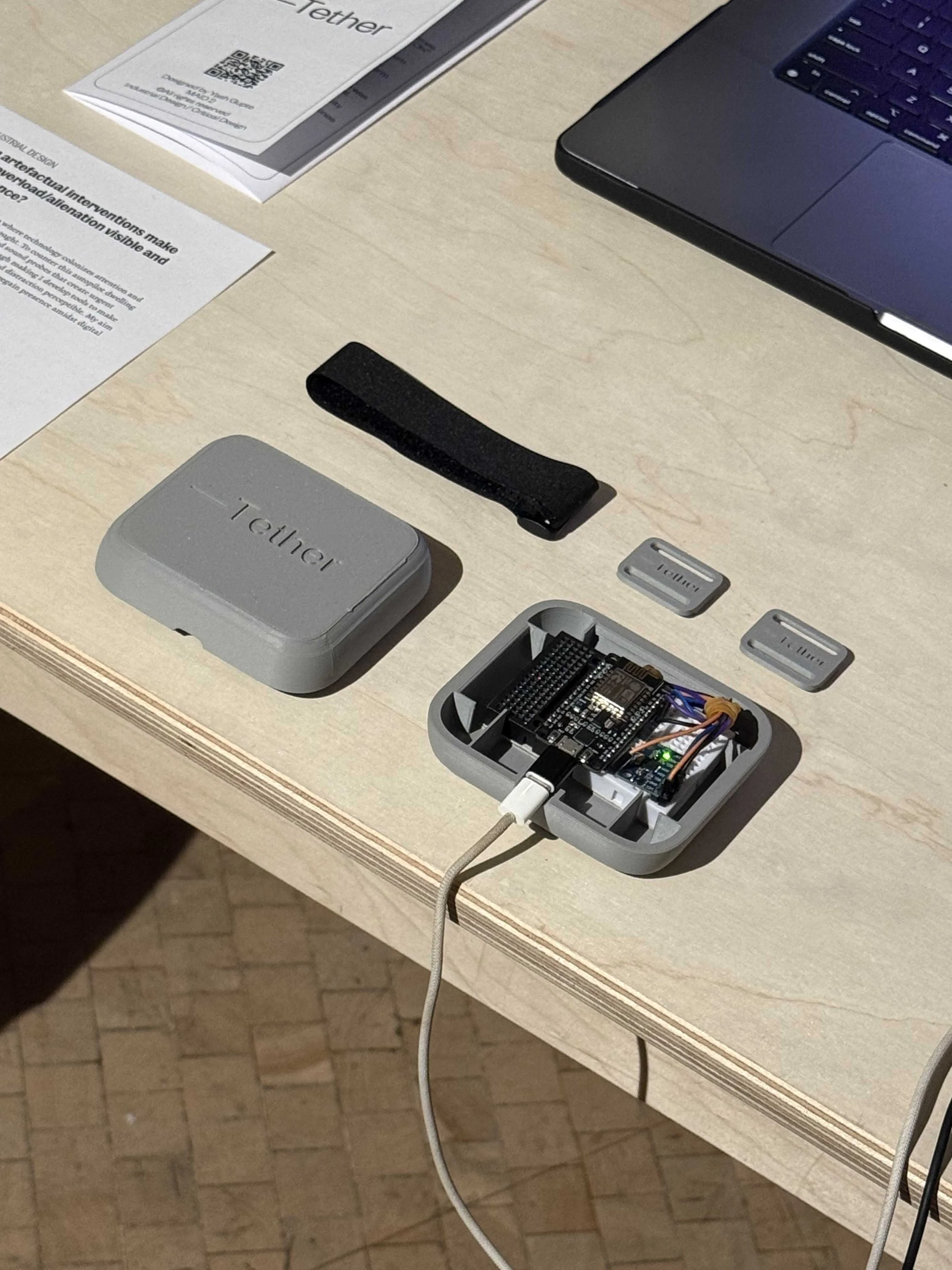Tether reveals the invisible mechanics of cognitive alienation by sonifying the hidden pressures of the attention economy, specifically the urge to rush, fidget, or drift, the project exposes how our environment forces us into an "autopilot dwelling of life".